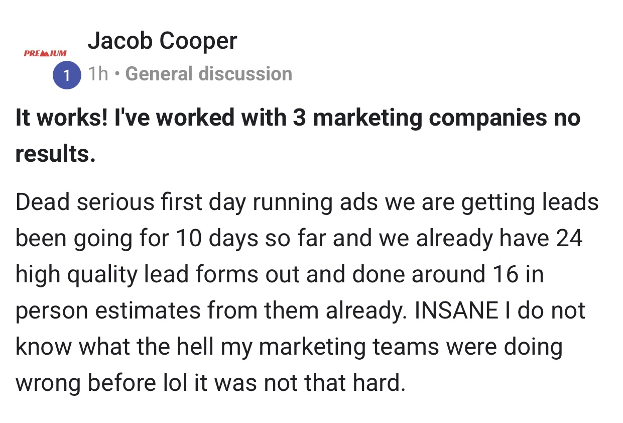 The ads are run under your own campaign, so the leads go directly to you. Unlike lead-selling platforms, you’re not competing with 5 other contractors for the same customer.