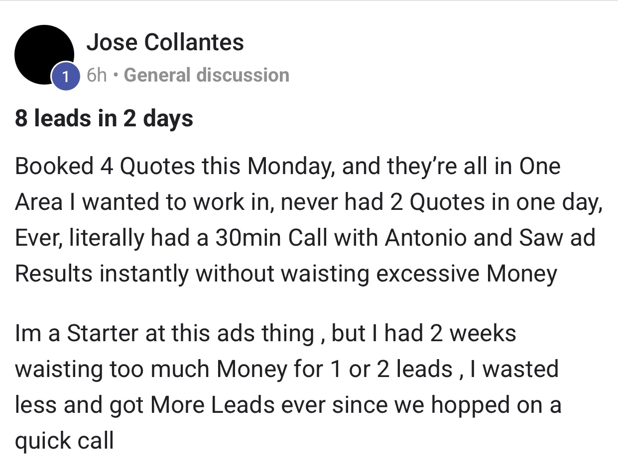 Most clients see leads within 24 hours of launching meta ads. We move quick so you can start booking jobs right away.